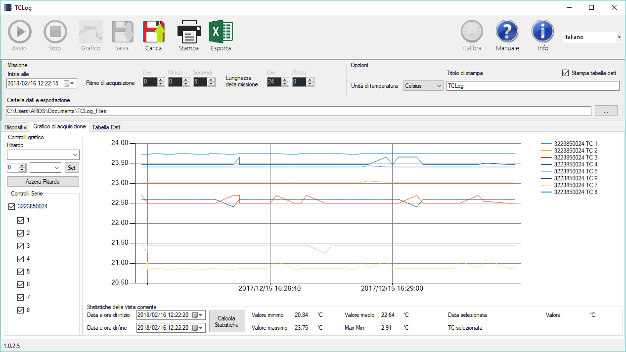 TC-Log (all versions) management software. Start and download loggers, connect multiple loggers together and see both graph and table of each. Possibility to select the curves to show on the graph and to monitor real time data when loggers are connected by means of the interface. Export data into excel and print complete reports. Possibility to calibrate each sensor by the user.